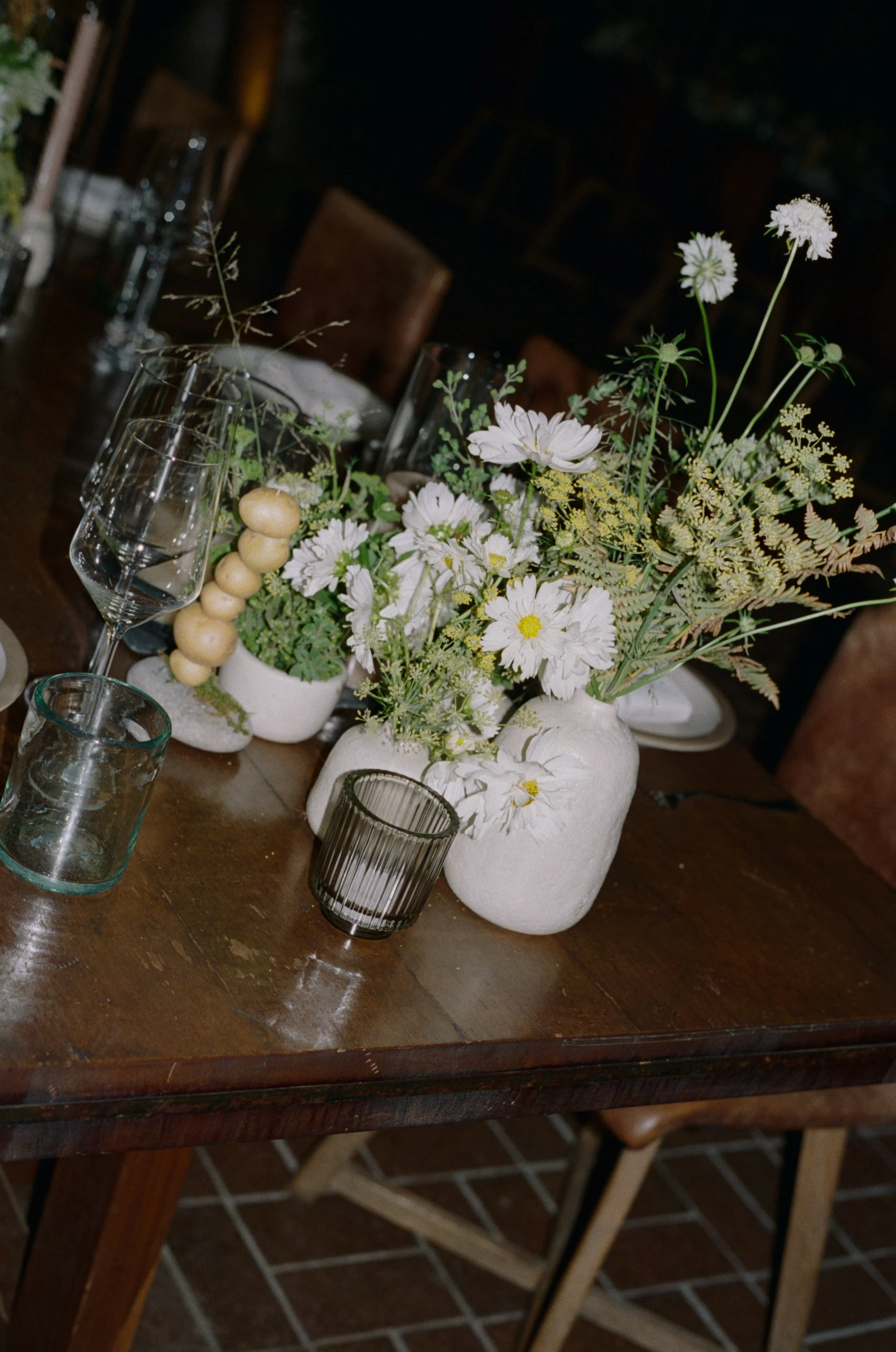 With an intimate ceremony at the bride’s parent’s private estate in wine country, followed by a restaurant buyout for dinner, this wedding was beautifully personal. It was important to stay connected to the wine country setting with distinctly Northern Californian grasses and wildflowers, and onto that base we layered textural styling elements that infused our couples personalities into the rest of the night. Date palm, enoki and oyster mushrooms, bitter melons, long beans, potato chains, artichokes, chives, cabbage leaves—every tablescape was perfectly unique.